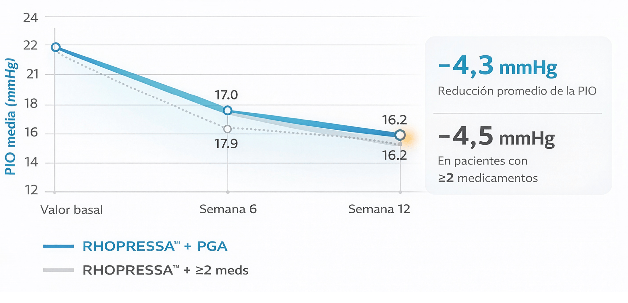1. Rhopressa TM (netasurdil) (prospecto del empaque) 2. Zaman F, Gieser SC, Schwartz GF, Swan C, Williams JM. A multicenter, open-label study of netarsudil for the reduction of elevated intraocular pressure in patients with open-angle glaucoma or ocular hypertension in a real-world setting. Curr Med Res Opin. 2021;37(6):1011-1020. 3. Latanoprost–netarsudil for previously treated primary open-angle glaucoma or ocular hypertension. Technology appraisal guidance Reference number:TA1009 Published: 02 October 2024. Overview | Latanoprost–netarsudil for previously treated primary open-angle glaucoma or ocular hypertension | Guidance | NICE 4. Abu Bakar, A. S., Razali, N., Hassan, M. D. S., & Agarwal, R. (2021). Medical management of open-angle glaucoma: Focus on mechanisms of action and adverse drug reactions. Journal of Clinical and Health Sciences, 6(1), 4–17. Medical_Management_of_Open-Angle_Glaucoma_Focus_on_Mechanisms_of_Action_and_Adverse_Drug_Reactions.pdf * En pacientes contraindicados a β‑bloqueadores. | 5. Registro Sanitario aprobado en Ecuador como medicamento nuevo.